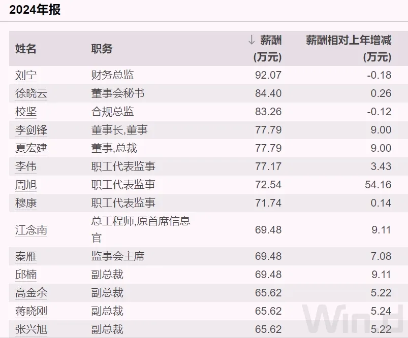 2024年,公司财务总监刘宁薪酬最高,超过92万元,董事长李剑锋、总裁夏宏建都不到78万元,副总裁薪酬不到70万元。