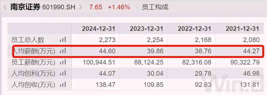 截至2024年末,南京证券职工总数2273人,当年人均创利44万元,人均薪酬44.6万元,比2023年增加4.7万元;也略高于国联民生(人均薪酬42.5万元)。2025年,南京证券业绩有望创新高,薪酬或有望继续提升。