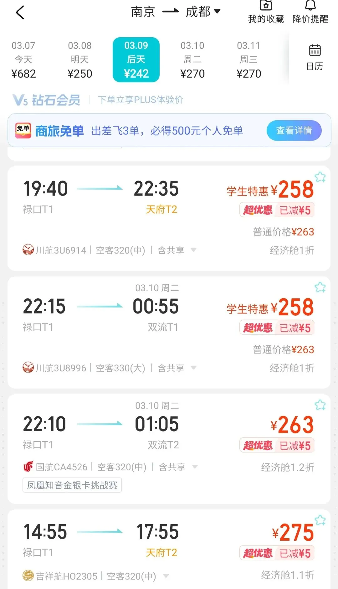 之前说过,南京=重庆全年都是好价,就像武汉=济南一样,特别是国航系的,很适合刷航段。南京=成都价格也还行,偶尔还会上川航的宽体。
