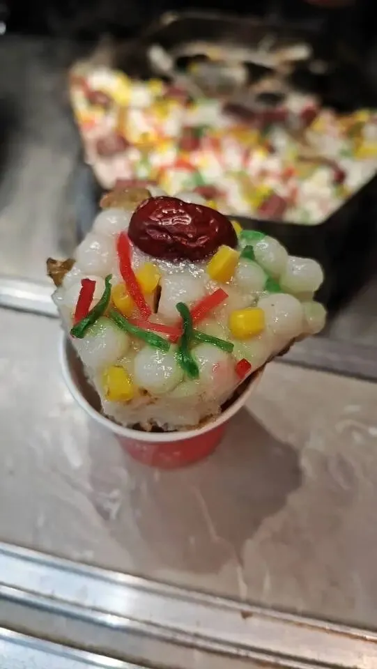 梅花糕:形似梅花,外皮松软,内馅是滚烫的豆沙,顶部铺满果仁、红枣香甜可口。