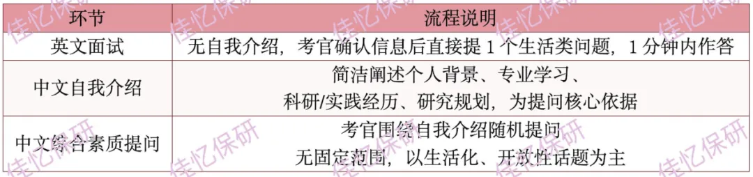 候考(禁电子设备,仅可带纸质资料,无需抽签,工作人员排序)→英文面试(2位考官,无自我介绍,1个问题即时作答)→中文综合素质面试(多位考官,1位主考且轮换,先自我介绍再提问)→面试结束直接离场。