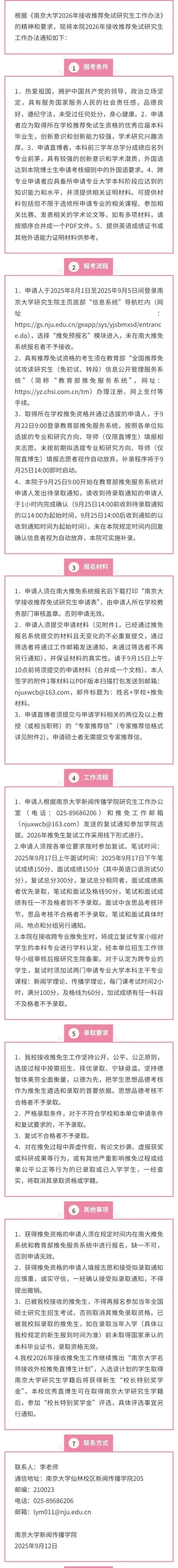 南京大学新闻传播学院2026年接收推荐免试研究生工作实施细则