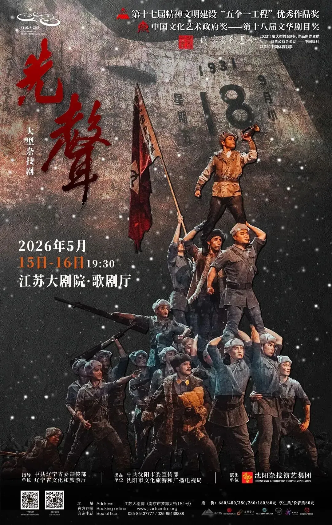 2026年5月15日-16日,荣获第十七届精神文明建设“五个一工程”戏剧类“优秀作品奖”、第十八届文华奖“文华剧目奖”的双料国家级最高荣誉作品——大型杂技剧《先声》将在江苏大剧院震撼上演,此次南京站演出也是《先声》年度全国巡演首站。