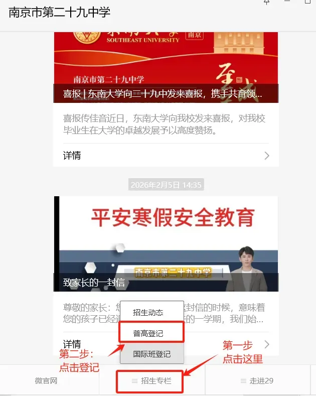 1. 微信打开【南京一中】公众号 2. 点击信息界面左下角—【招生登记】—【信息登记】