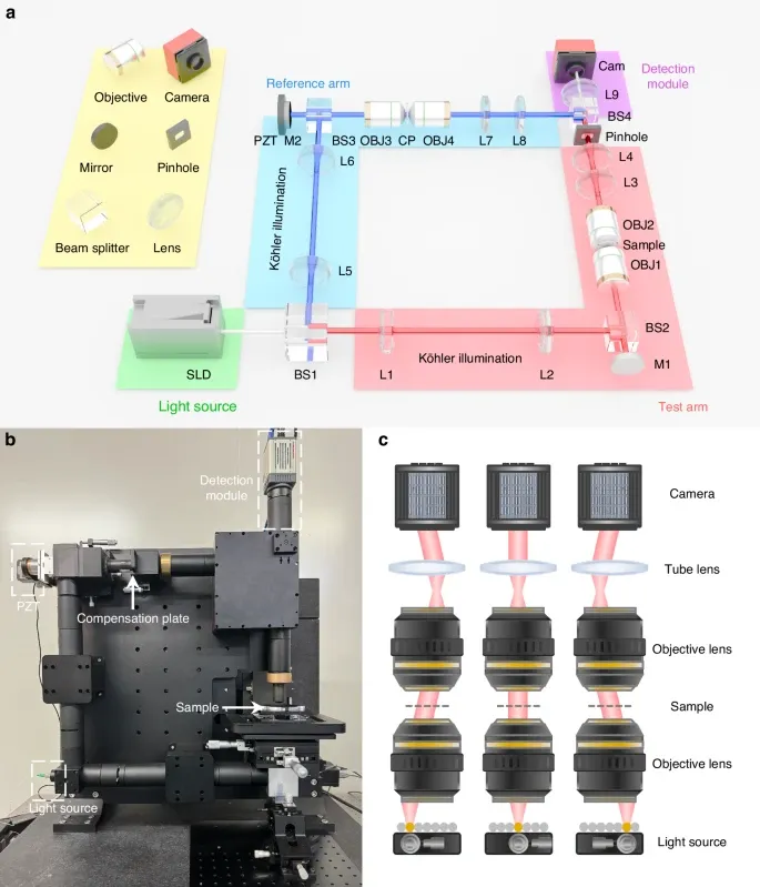 a基于透射式Linnik干涉仪的FP-CSI光学示意图。近红外超辐射发光二极管SLD在不同位置提供准点照明,从而生成不同入射角的照明。参考臂与测试臂以Linnik方式对称配置,包含柯勒照明模块(L1、L2、L5、L6)、近红外物镜(OBJ1–4)与中继透镜(L3、L4、L7、L8)。在测试臂中,小孔与物镜瞳面共轭。参考臂中,压电致动器PZT在轴向扫描时调制光程。此外,补偿片CP(厚度与材料与样品一致)放置在OBJ3与OBJ4的同焦平面处。干涉图经筒镜L9传递并由近红外InGaAs相机Cam采集,作为探测模块。SLD:超辐射发光二极管;BS:分束器;L:透镜;M:反射镜;OBJ:物镜;CP:补偿片;Cam:近红外相机;PZT:压电致动器。b与(a)对应的FP-CSI实验系统实物搭建。c通过平移光纤光源生成不同入射角的准平行照明示意:光源位移越大,入射角越大,对应采样到样品角谱中更高的空间频率分量。