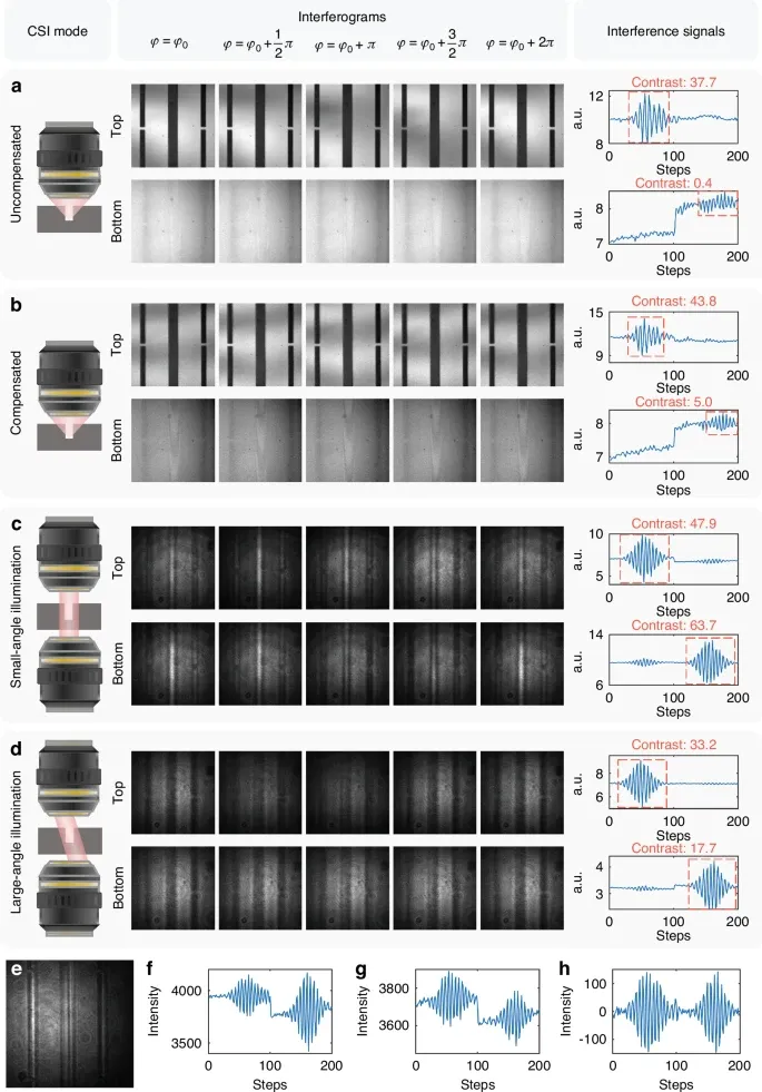 a–d在选定轴向位置(步进delta_phi=pi/2)下的代表性干涉图与对应干涉信号:反射式Linnik在无波前补偿(a)与加入可变形镜补偿(b)时的结果;FP-CSI在法向入射(c,theta=0 deg,NA=0)与斜入射(d,theta=15.8 deg,NA=0.27)下的结果。e未使用小孔滤波时的FP-CSI干涉图,可见明显衍射花纹且对比度下降;对比(c)(d)中使用小孔后的高对比干涉条纹。f从沟槽底部提取的原始干涉信号(theta=8.6 deg,NA=0.15)。g从沟槽底部提取的原始干涉信号(theta=23.5 deg,NA=0.40)。h对(g)做经验模态分解后得到的校正干涉信号。