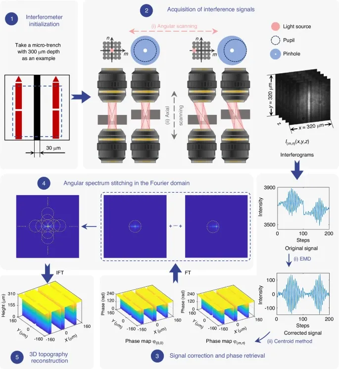 以宽30 um、深300 um的高深宽比微沟槽为例:步骤1,干涉仪初始化,将样品顶面放在测试臂物镜的同焦平面,并在参考臂放置与样品等厚同材质的补偿片;步骤2,进行轴向与角度扫描获取干涉图;步骤3,使用经验模态分解进行信号校正,并用质心法提取各角度的相位图;步骤4,在傅里叶域进行角谱拼接,将各角度相位图对应的子区域线性合成得到完整相位分布;步骤5,将拼接后的相位转换为三维形貌高度。EMD:经验模态分解;FT:傅里叶变换;IFT:逆傅里叶变换。