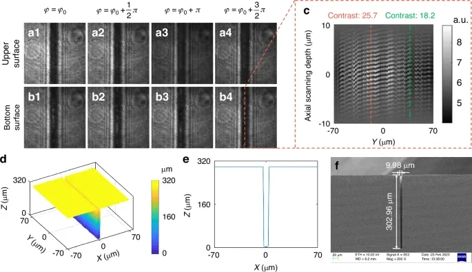 a1–a4沟槽上表面的干涉图。b1–b4沟槽底部表面的干涉图。c沿(b4)中标出的采样线提取的轴向干涉信号:扫描范围内的高对比条纹表明可从沟槽底部稳定提取相位,条纹对比度的局部变化提示可能存在表面粗糙或散射特征。d重建得到的三维形貌。e从(d)提取的截面轮廓。f用于验证的同一沟槽SEM图像。