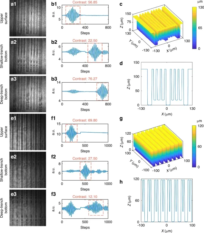 a1–a3传感器1在顶面、浅沟槽底部、深沟槽底部的干涉图。b1–b3传感器1代表性位置的轴向干涉信号。c传感器1的三维形貌重建。d从(c)提取的截面轮廓。e1–e3传感器2的干涉图,展示与不同沟槽层级对应的三个结构平面。f1–f3传感器2代表性位置的轴向干涉信号,对应三个结构平面。g传感器2的三维形貌重建。h从(g)提取的截面轮廓。