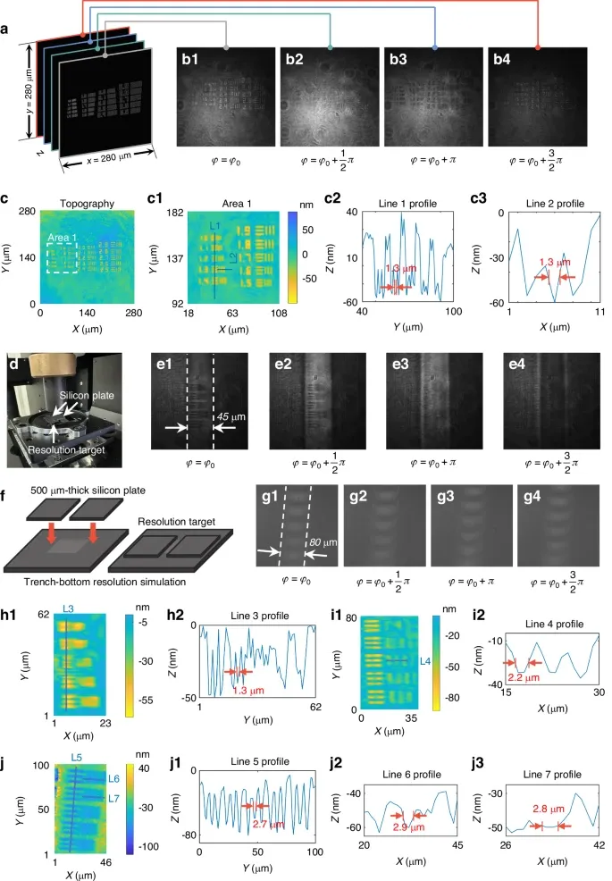 a自制相位型分辨率靶标,由不同空间频率的线对组成。b1–b4裸分辨率靶标的代表性FP-CSI干涉图。c裸分辨率靶标的形貌重建。c1(c)中选定子区域(area 1)的形貌重建。c2、c3(c1)中线对(line 1、line 2)的截面轮廓。d、f通过在分辨率靶标上叠放两片本征硅片形成等效高深宽比沟槽结构,使线对位于沟槽底部。e1–e4叠片结构下的代表性FP-CSI干涉图。g1–g4使用反射式Linnik干涉仪采集到的干涉图。h1、i1 FP-CSI对沟槽底部线对的重建结果(深宽比约11:1)。h2、i2从(h1、i1)提取的截面轮廓。j反射式Linnik对宽80 um沟槽(深宽比6.25:1)的重建结果。j1–j3从(j)提取的截面轮廓。