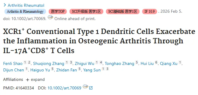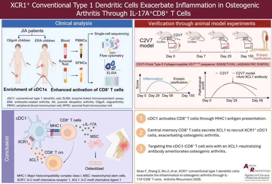 骨生成关节炎以异位骨化和附着点炎为核心特征,致病机制不明。孙洋、陈迪俊团队通过单细胞RNA测序、TCR 图谱分析 33 例患者样本,创建C2V7小鼠模型,结合流式细胞术、免疫荧光等技术,首次揭示XCR1+1型常规树突状细胞(cDC1)通过激活IL-17A+CD8+T细胞加剧炎症,为治疗提供新靶点。
