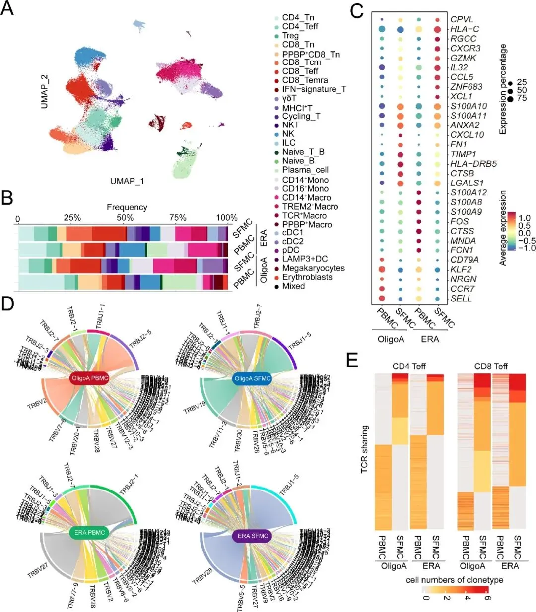 收集ERA、寡关节炎(OligoA)患者配对外周血和滑液样本,开展单细胞RNA测序、TCR 图谱分析及流式细胞术验证