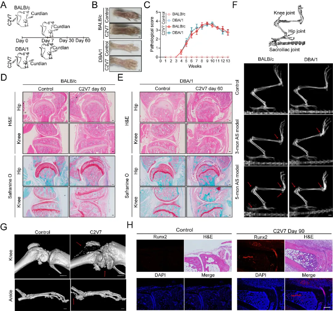 图 4.单次接种C2V7可在BALB/c和DBA/1小鼠中诱发类强直性脊柱炎(AS)关节炎
