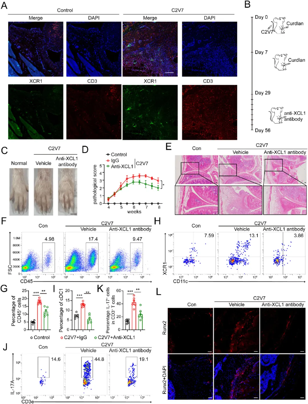 C2V7小鼠关节中cDC1和IL-17A+CD8+T细胞大量浸润,CD8+T细胞占比超CD4+T细胞,且80%以上分泌IL-17A;注射XCL1中和抗体后,小鼠关节肿胀减轻、炎症细胞浸润减少,cDC1和IL-17A+CD3+T细胞积累受阻,异位骨化也得到显著抑制。(图 5,图6 )
