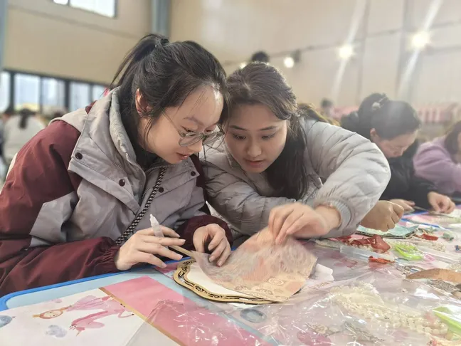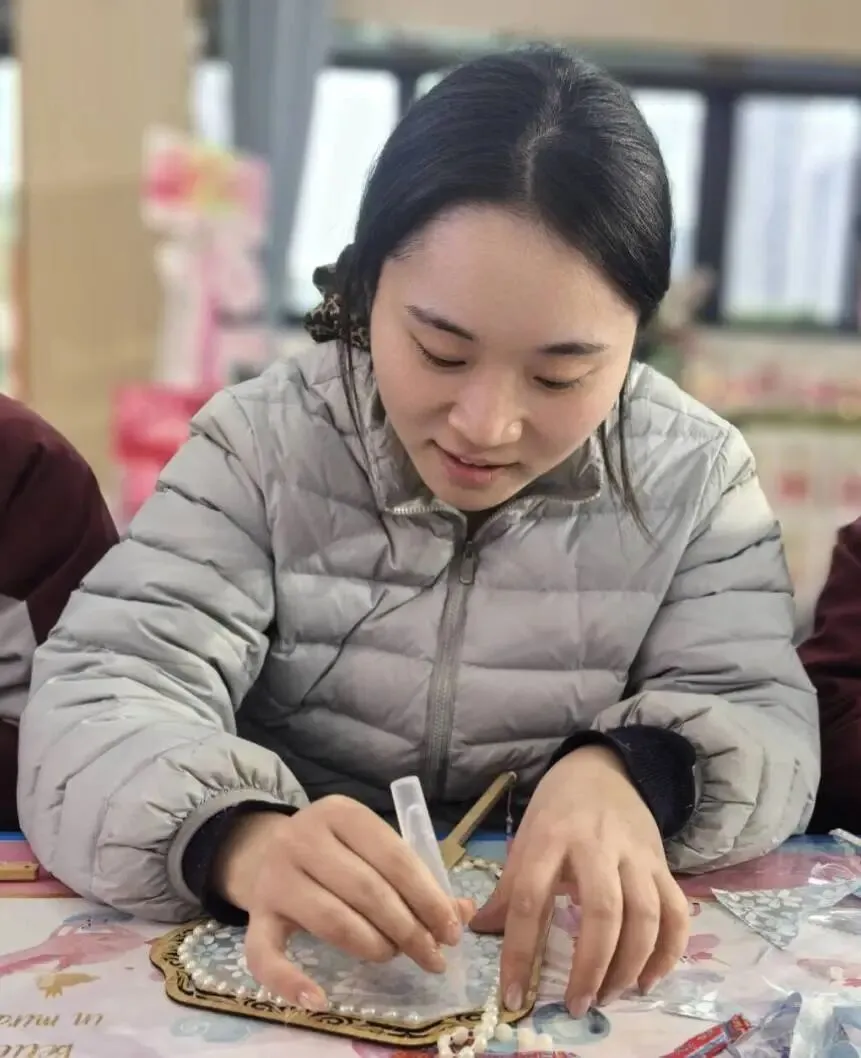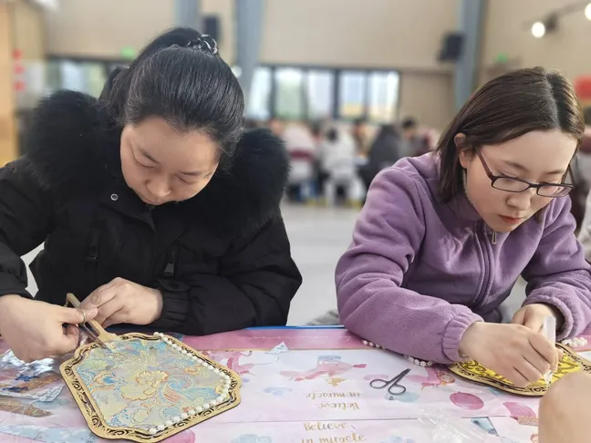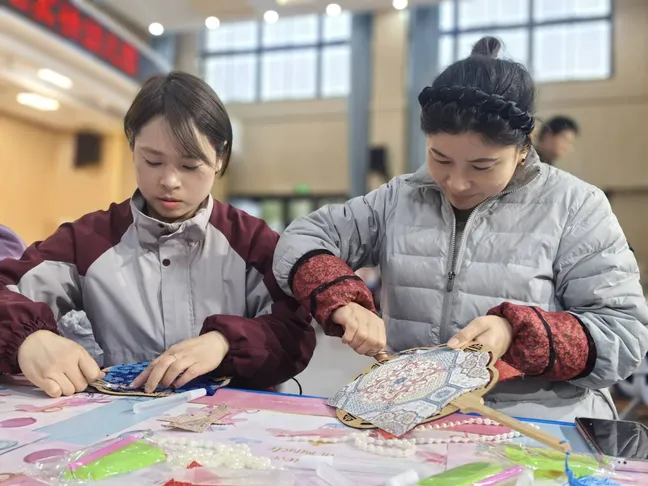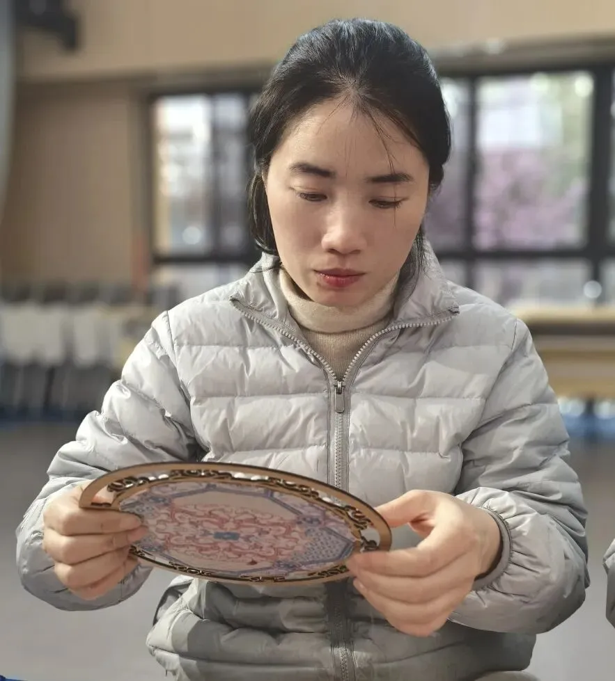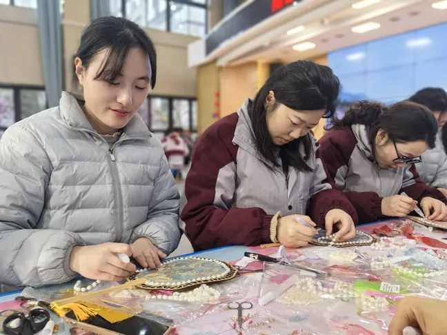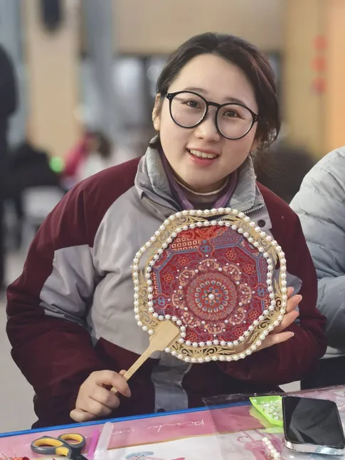 大家手执工具,精心选择宋锦布料,铺陈、固定、缀饰珍珠,于指尖的灵动操作间,将古典雅致的宋锦美学与对生活的美好期许融于扇面,打造独一无二的宋锦珍珠团扇。在动手创作中,感受非遗文化的独特魅力,于慢时光里体味生活之美。