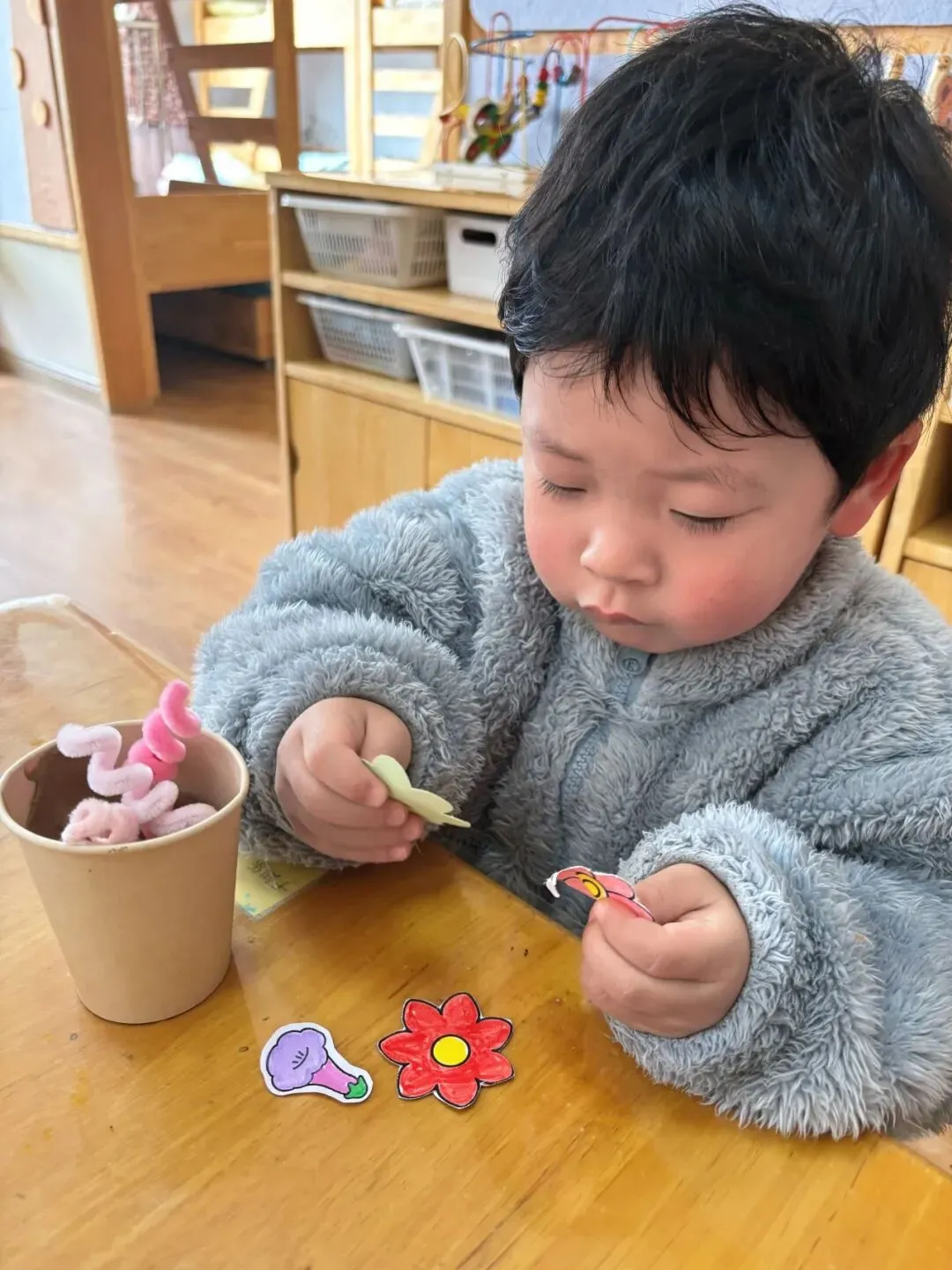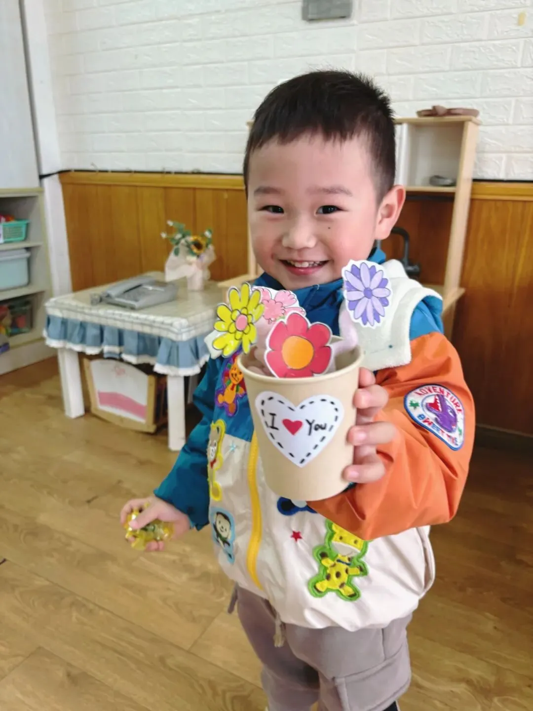 孩子们用小手剪一剪、贴一贴,制作美丽的花束。花朵在他们手中绚烂盛放,每一朵花,都是爱的独特表达,愿这份爱,随花香飘向远方,温暖每一个家庭。