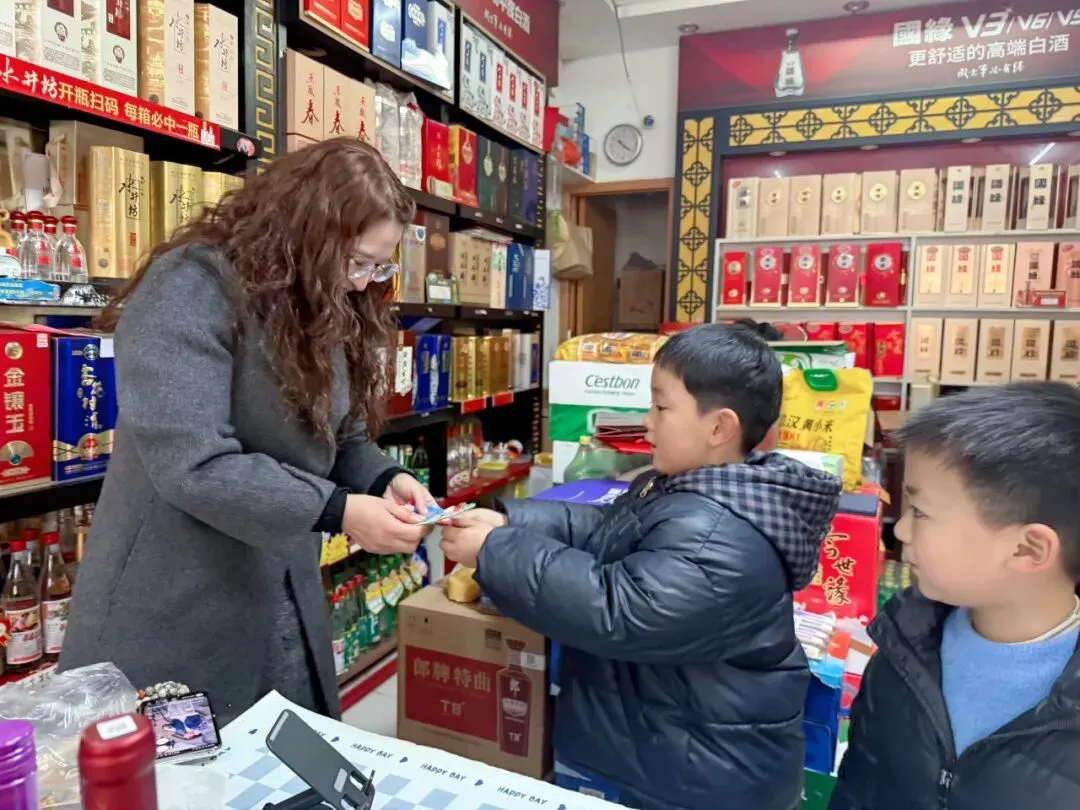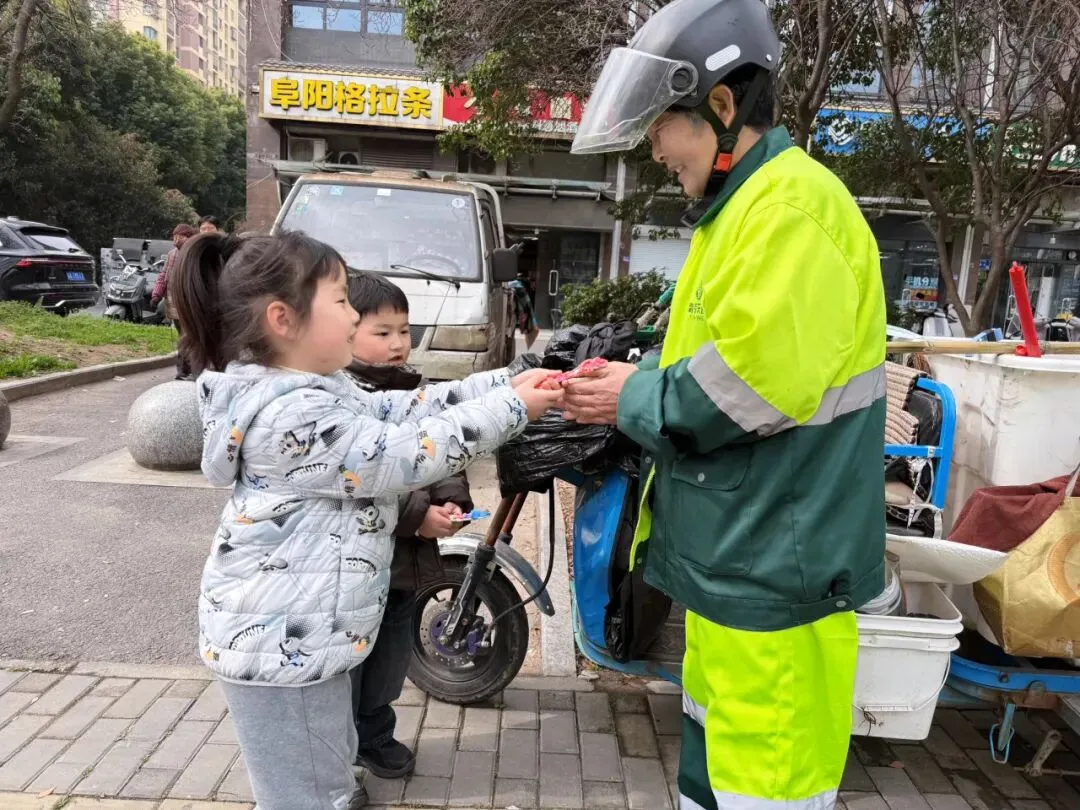 接着,孩子们又来到社区、沿街商铺,社区工作者收到礼物的时候,她们的脸上写满了惊喜和感动。孩子们对她们说:“你们真棒!”这一刻,尊重,就是最好的礼物。