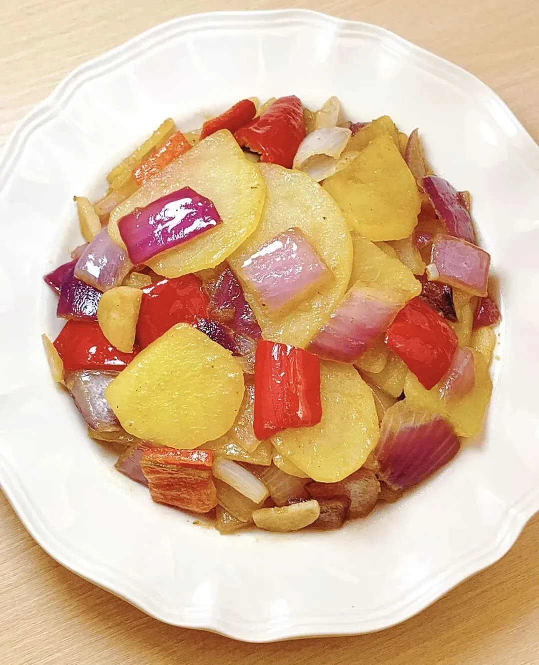 彩椒洋葱土豆片、菠菜鸡蛋汤