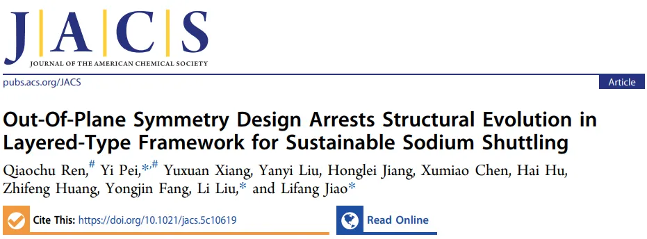 2026年3月4日,湘潭大学刘黎、南开大学焦丽芳、南京航空航天大学裴一在国际知名期刊Journal of the American Chemical Society发表题为《Out-Of-Plane Symmetry Design Arrests Structural Evolution in Layered-Type Framework for Sustainable Sodium Shuttling》的研究论文,Qiaochu Ren、裴一为论文共同第一作者,刘黎、焦丽芳、裴一为论文共同通讯作者。