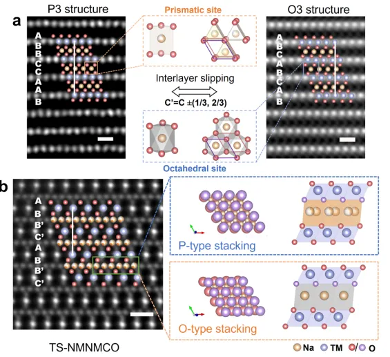 钠(Na)的丰富储量使钠离子电池(SIBs)成为大规模、低成本储能系统的一个极具前景的体系,但其实际应用仍受限于正极材料令人不满意的能量密度。解决这一问题的常规方法之一是采用密堆积的氧框架,由此制备的NaₓTMᵧO₂(0<x,y<2, TM=Ni,Mn,Co等)型正极具有约240 mAh g⁻¹的理论容量和高达约700 Wh kg⁻¹的能量密度。然而,与LixTMyO₂中的O型(O代表八面体)堆叠不同,Na较低的电荷密度(较小的离子势)使其同时具备O型和P型(P代表棱柱)堆叠能力;这种双重堆叠特性在高度脱/嵌钠状态下会触发氧的反复重排,阻碍了SIBs的高容量运行。因此,推动SIBs应用最关键的一步是建立一种能抵抗Na⁺脱出/嵌入的稳定氧堆叠结构。