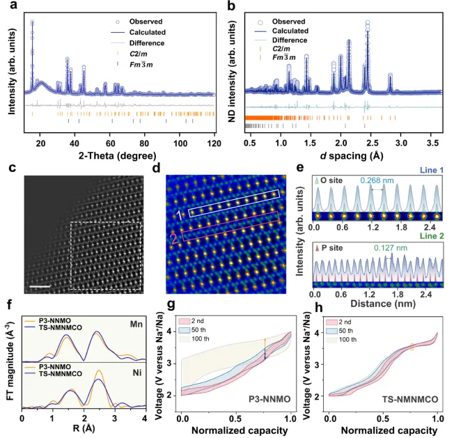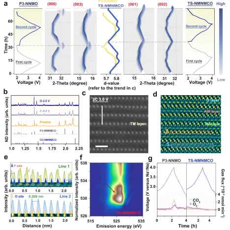 通过构建单斜畸变,作者建立了一种独特的面外对称性,使Na⁺离子的P型和O型间隙位点能够共存,从而有效防止了层间氧离子滑移及随后的对称性演变,即使在深度脱钠状态(每化学式单元剩余<0.2个Na⁺)下亦是如此。