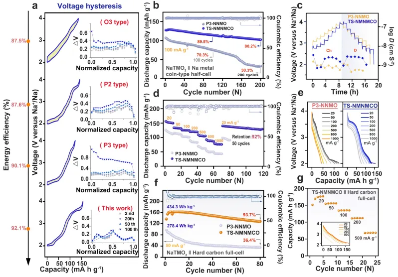 该研究取得了突破性成果,TS-NMNMCO正极在高能量密度(437.1 Wh kg⁻¹)下实现了超稳定的循环性能,100次循环后电压滞后平均仅为0.16 V,远优于传统P3材料(0.71 V)。其全电池也展现出卓越的性能(434.3 Wh kg⁻¹)。这项工作不仅首次揭示了面外对称性在稳定层状正极中的决定性作用,为解决钠电高电压正极的结构不稳定性提供了全新范式,而且其设计理念对于开发下一代高能量密度、长寿命的可持续储能电池具有重要的指导意义和广阔的应用前景。