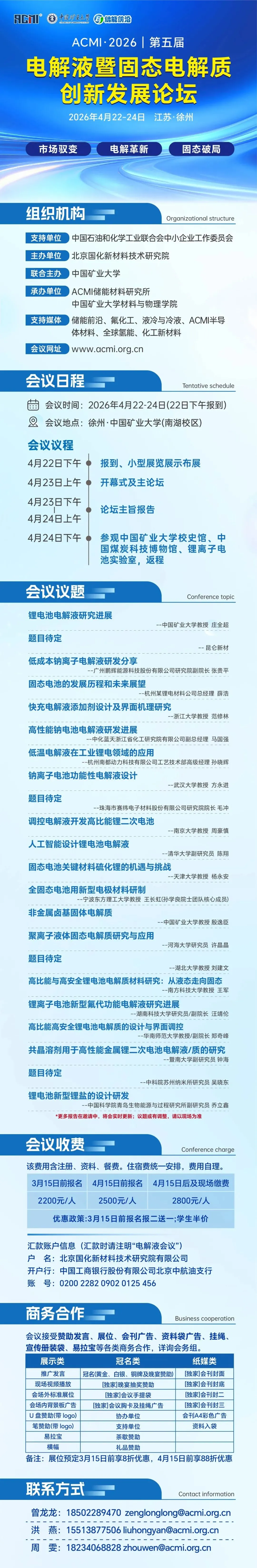 为凝聚产业链创新合力,研判市场趋势,推动电解液材料体系革新与固态电池产业化落地,我院联合中国矿业大学于2026年4月22-24日在徐州召开“2026(第五届)电解液暨固态电解质创新发展论坛”。本届论坛以“市场驭变、电解革新、固态破局”为主题展开深入交流。