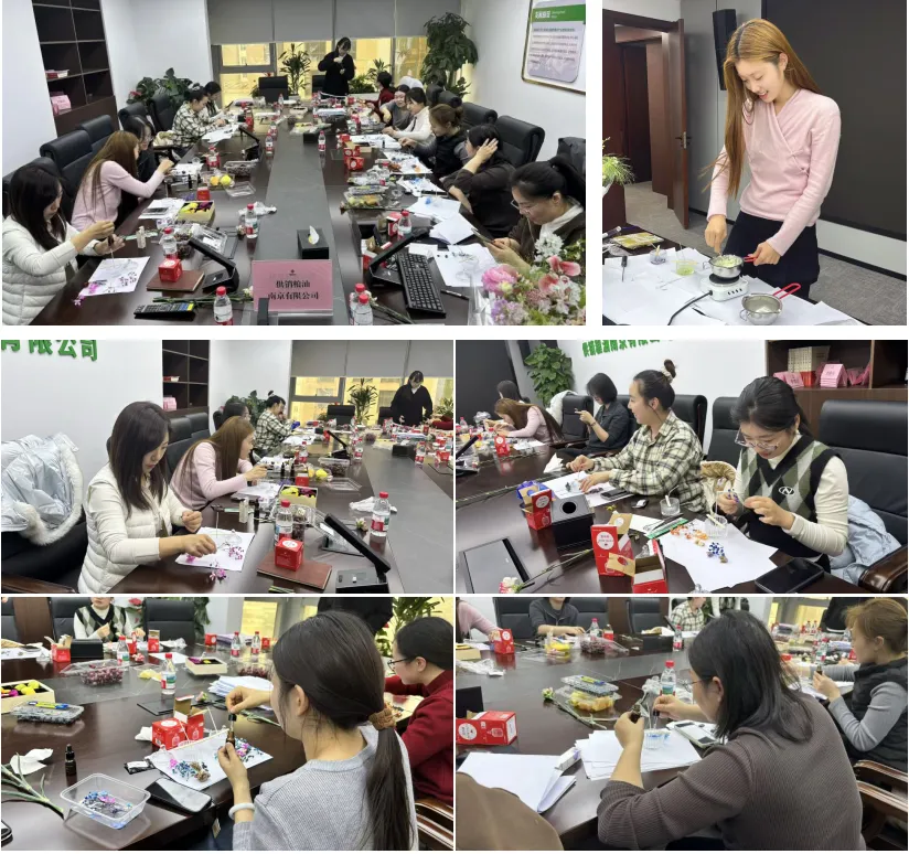 激烈的运动过后,活动进入了备受期待的“暖心手作”香薰蜡烛制作环节。会议室里瞬间弥漫起淡淡的精油香气。在指导老师的讲解下,大家精心挑选干花、构思造型,熔蜡、调香、装饰……每一个步骤都倾注了专注与巧思。当独属于自己的那份“芬芳”在手中诞生时,每个人的脸上都洋溢着成就感和幸福感。这份亲手制作的礼物,不仅点亮了节日氛围,更温暖了大家的心田。