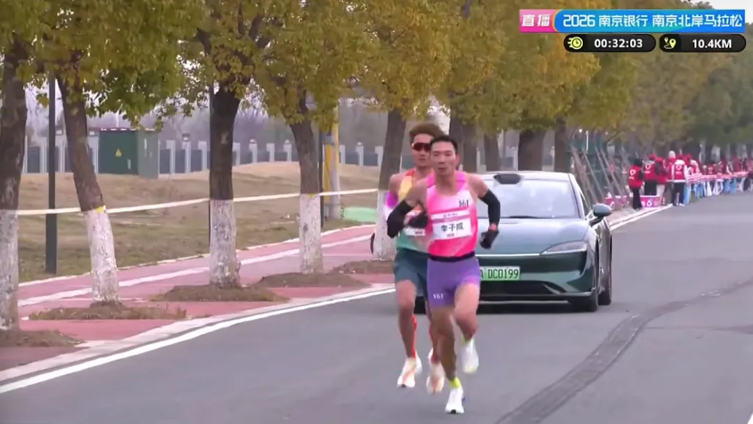 10KM后,男子第一梯队仅剩2人,由李子成带领王佳浩。10KM用时30分46秒,配速3分05秒。