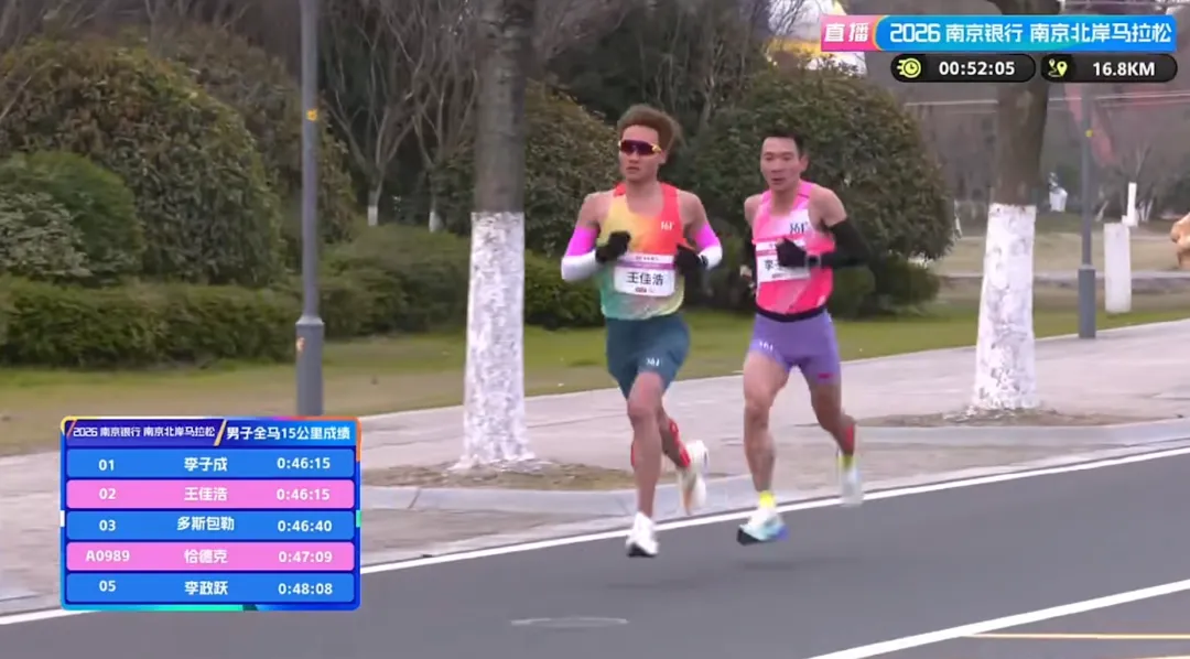 15KM,男子第一梯队用时46分15秒,配速3分05秒,李子成和王佳浩领衔。
