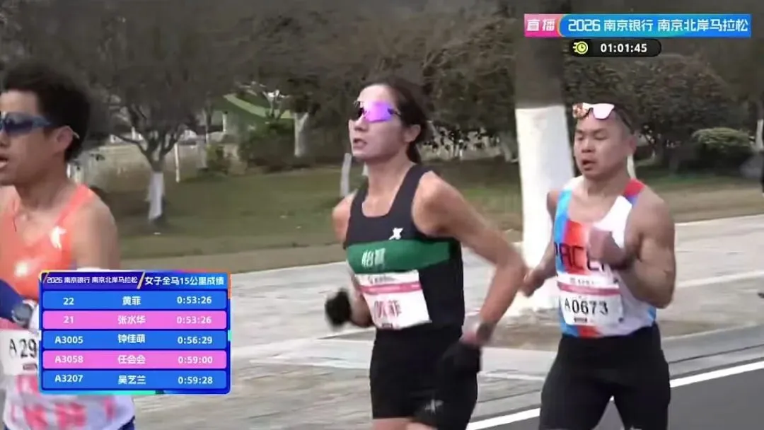 15KM,女子第一梯队用时53分26秒,配速3分34秒,黄菲和张水华领衔,第三身位的钟佳萌仅落后3秒。