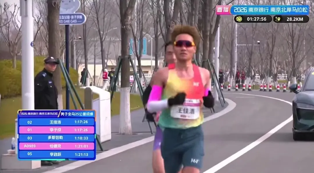 25KM,男子第一梯队用时1小时17分26秒,配速3分06秒,王佳浩和李子成领衔,第三位置的多斯包勒落后他们1分多钟。