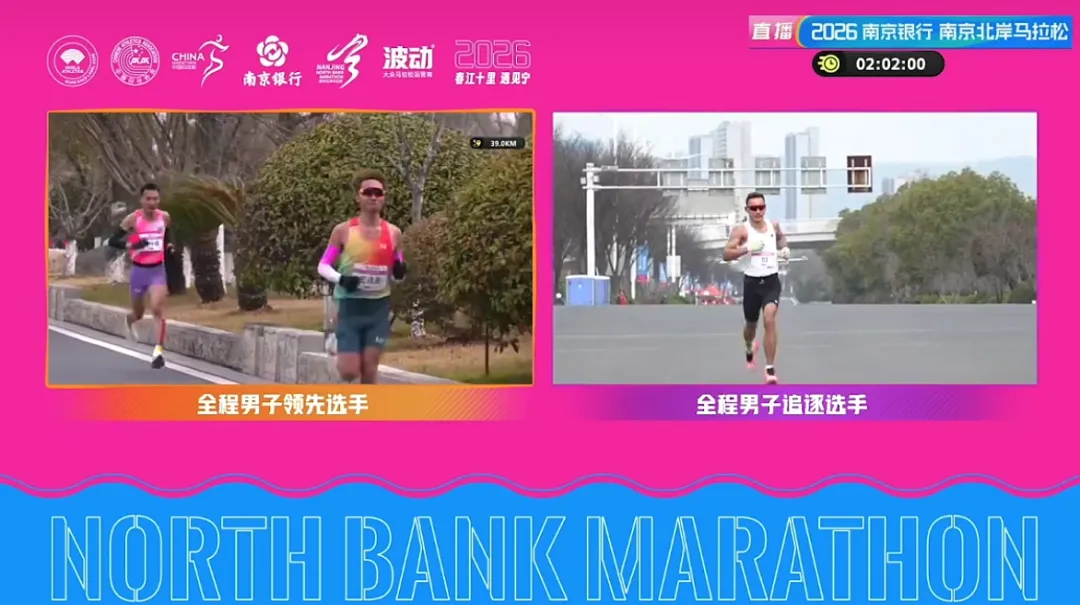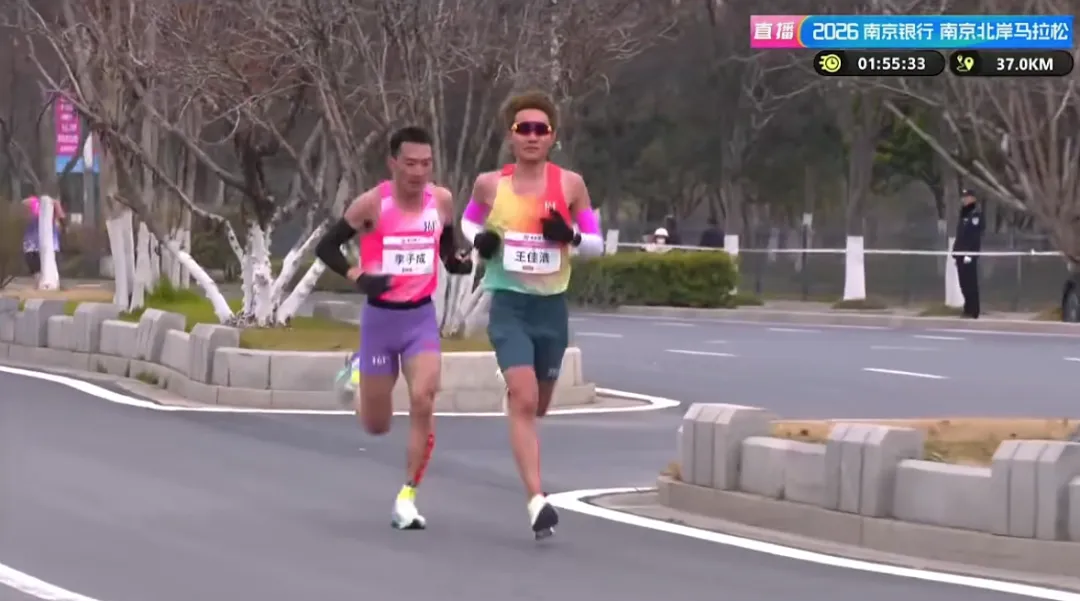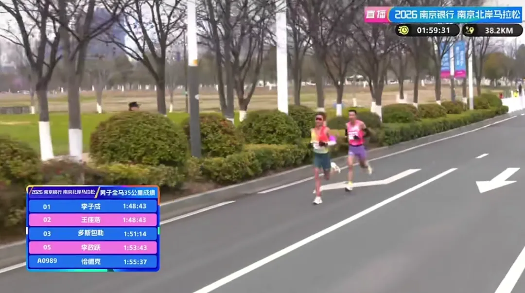 35KM,领先的李子成和王佳浩用时1小时48分43秒,配速3分06秒,有极大可能刷新赛会纪录。