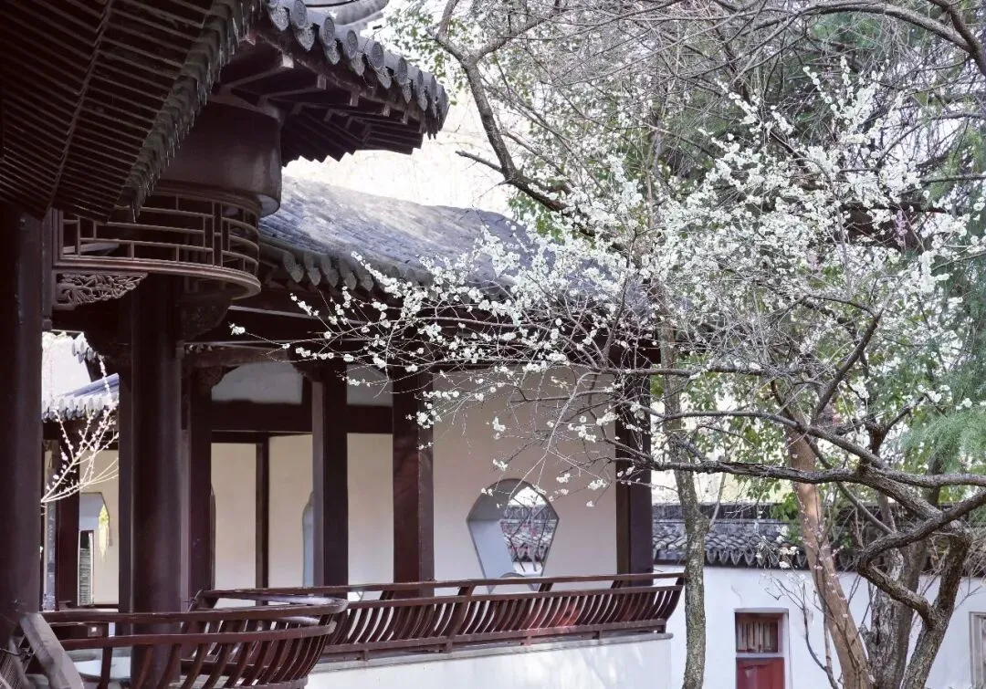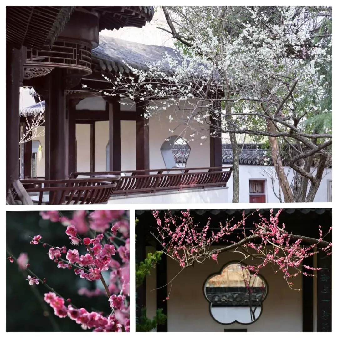 亭台依着山势,青瓦覆着,白墙静立,梅枝斜斜探出来,红的艳,白的素,绿的雅,疏疏落落绕着回廊漏窗。