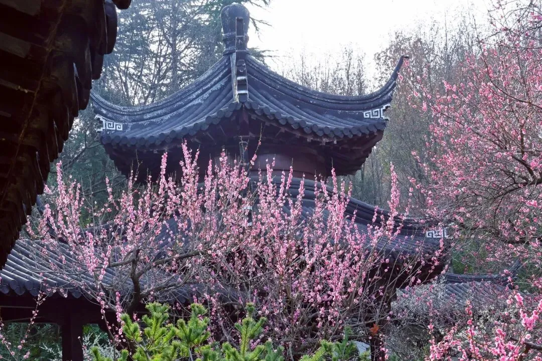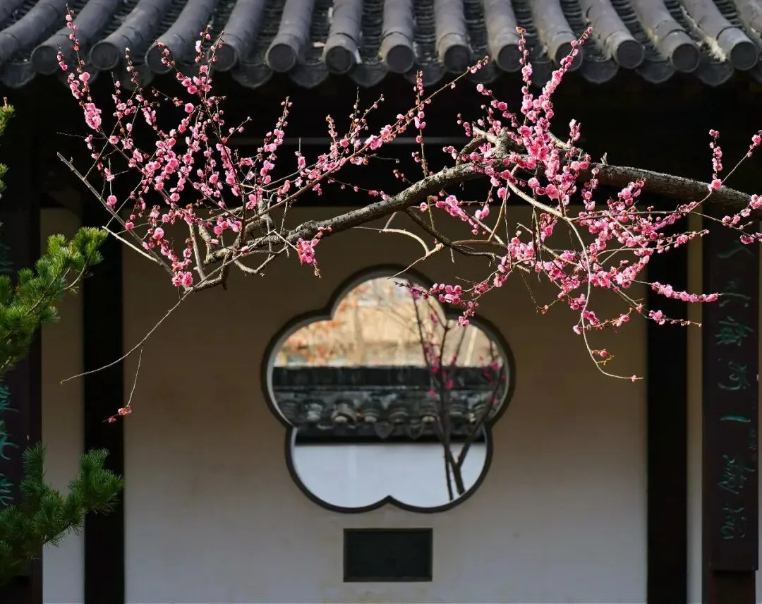 倚着飞檐拍梅,以窗为框取景,梅的清雅,古建的温婉,全都融进镜头里,比单拍花枝耐看多了,这才是南京的梅啊。