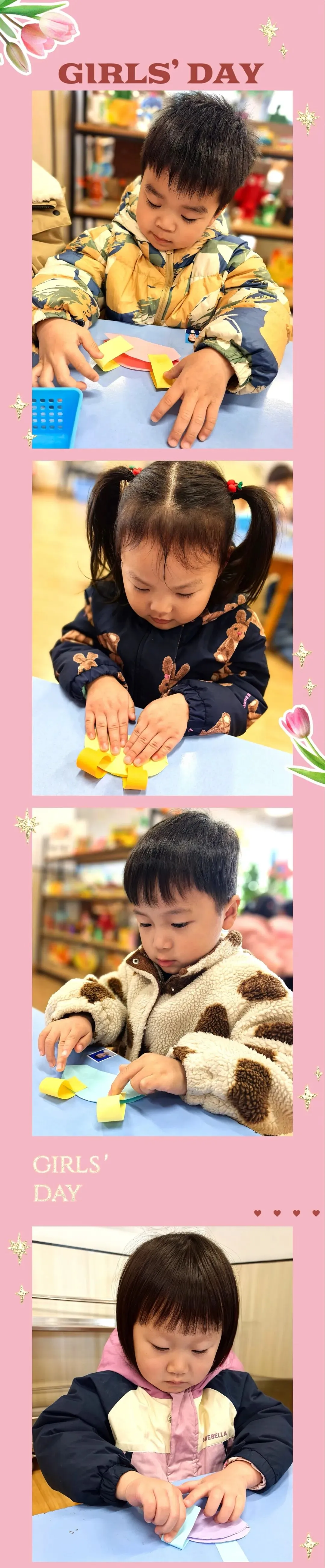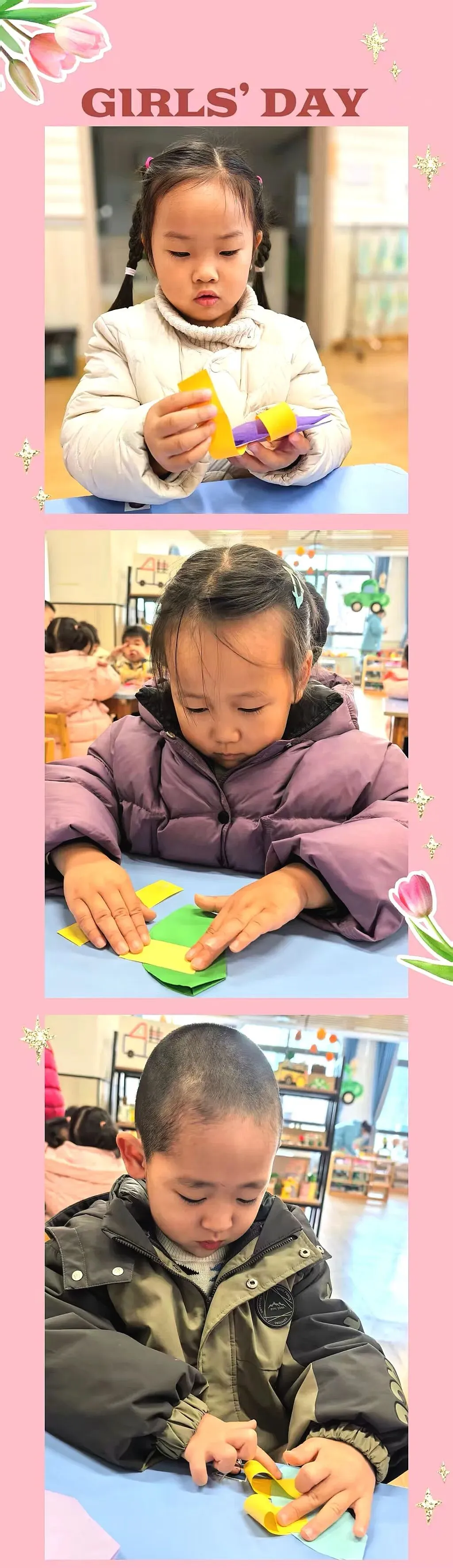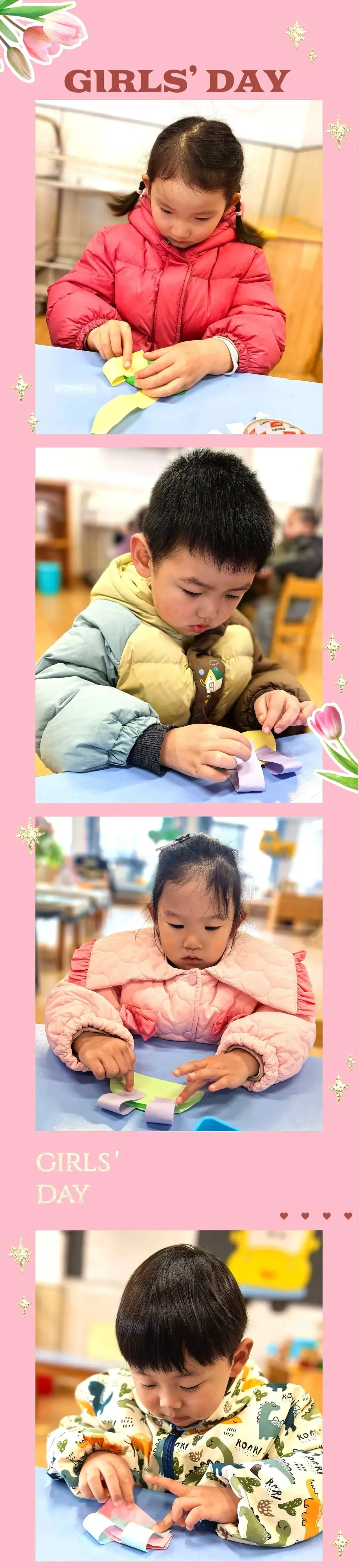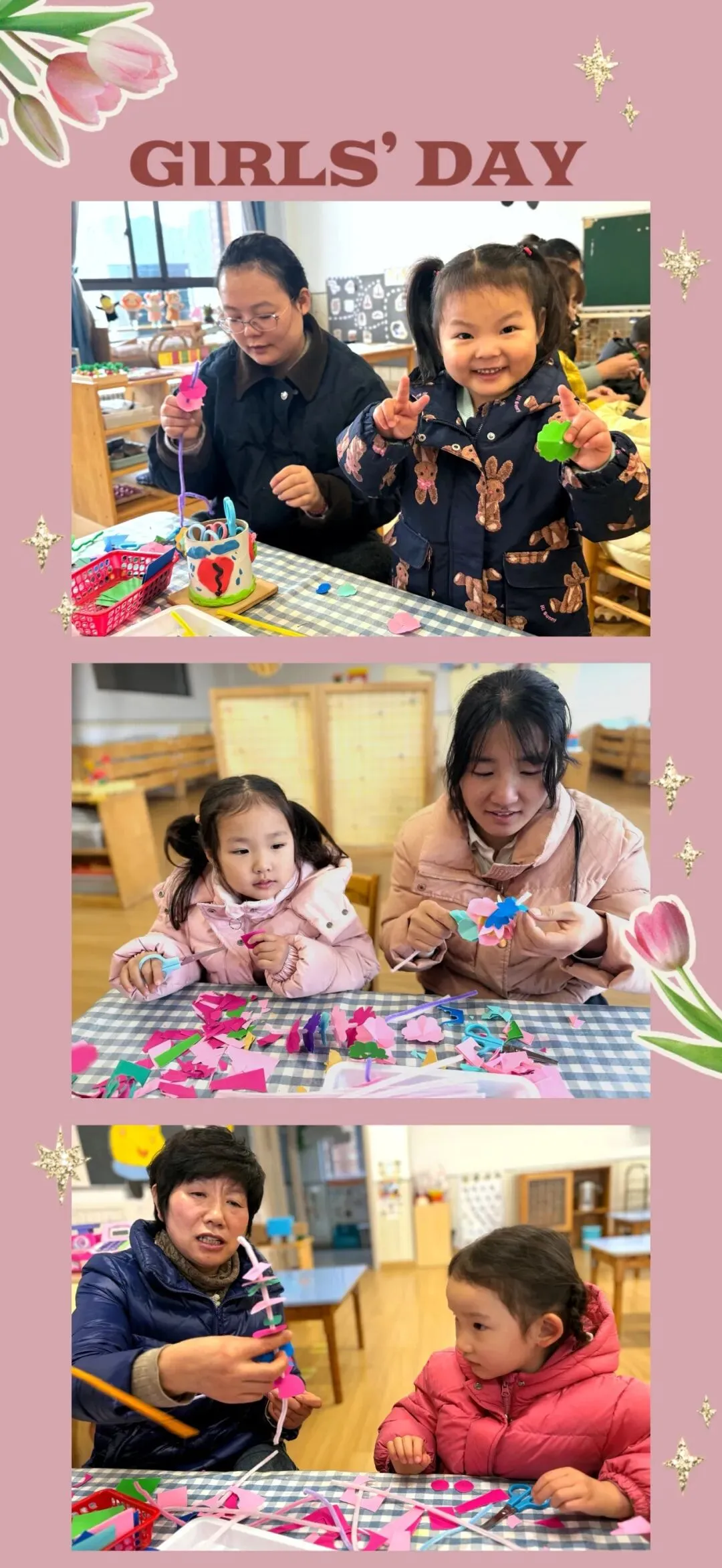 活动中宝贝们和妈妈、奶奶们围坐在一起,用剪刀剪出一片片粉嫩的花瓣;妈妈和奶奶则温柔地引导着,将这些彩片细心地穿在彩绳上,一起用双手创造了独属于彼此的温暖记忆。每一朵纸花,都是宝贝们对她们最真挚的告白;每一次合作,都是亲子间最珍贵的联结。