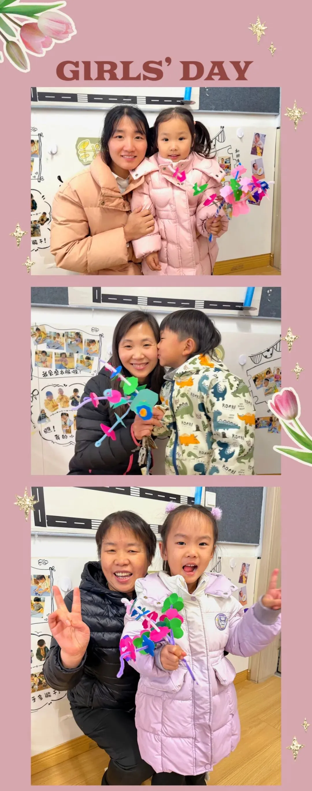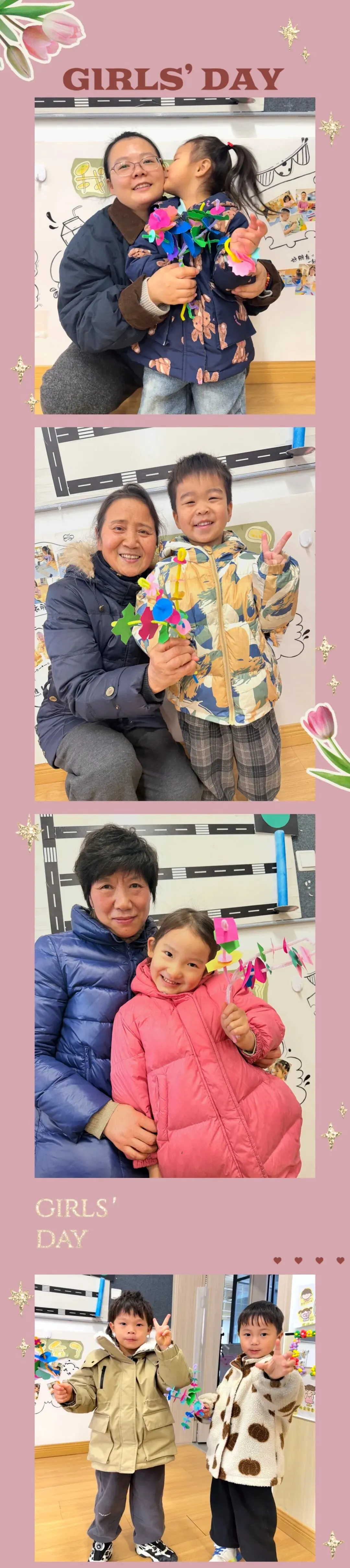 宝贝们高高举起色彩斑斓的花束,脸上是藏不住的骄傲与欢喜;妈妈和奶奶们则温柔地将他们拥在怀中,眼神里满是欣慰与爱意。