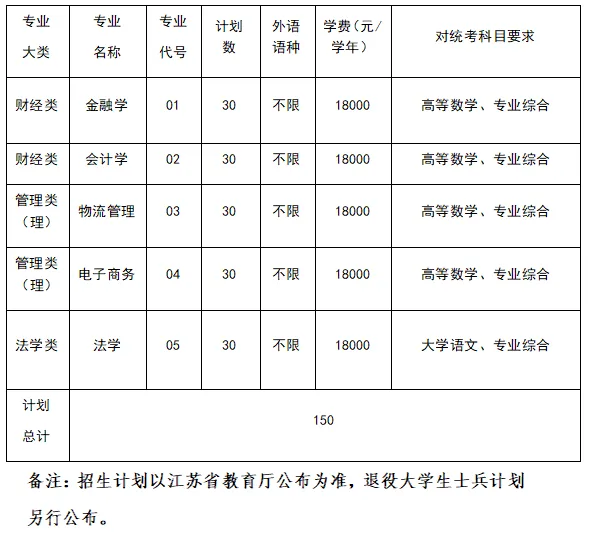 南京财经大学红山学院2026年面向江苏省招收会计学、金融学、法学、物流管理、电子商务5个专业共计150人。各专业计划及报考要求详见附件。