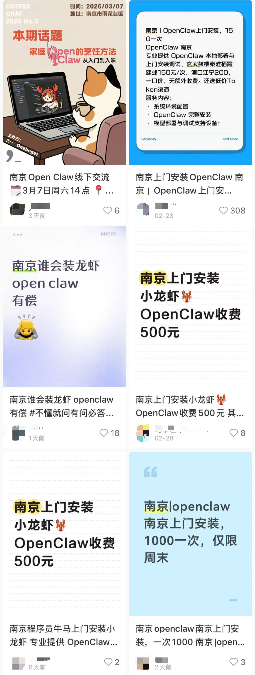 在一些平台搜索“龙虾/OpenClaw上门安装”,会发现这项服务价格从300元到1000元不等,500元/次为最常见的价格。也可以“远程安装”,价格在50-100元左右。有网友称几天内靠这项服务赚取26万元。