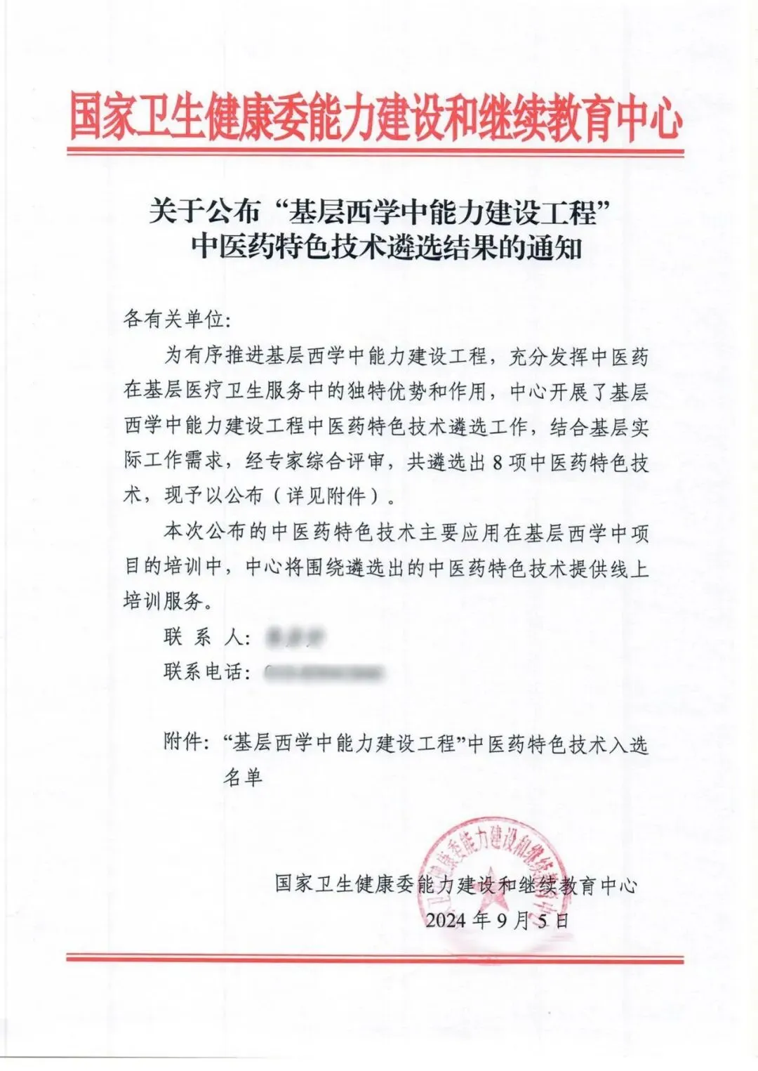 2024年9月5日,国家卫生健康委能力建设和继续教育中心正式公布“基层西学中能力建设工程”中医药特色技术遴选结果。