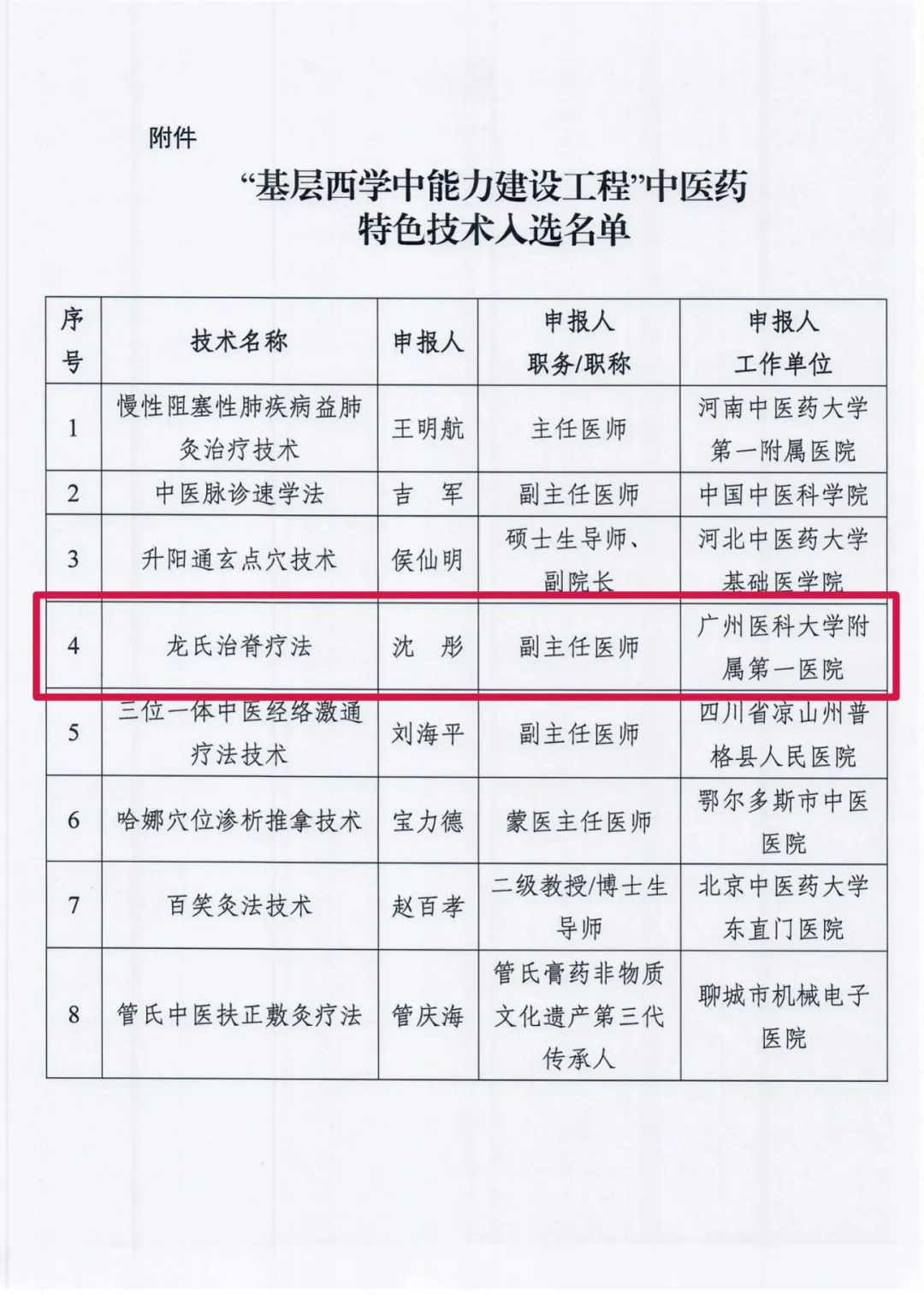 经专家严格评审,龙脊康沈彤主任团队申报的“龙氏治脊疗法”成功入选,成为本批次全国8项基层推广技术之一(项目编号:HC-BK-789)