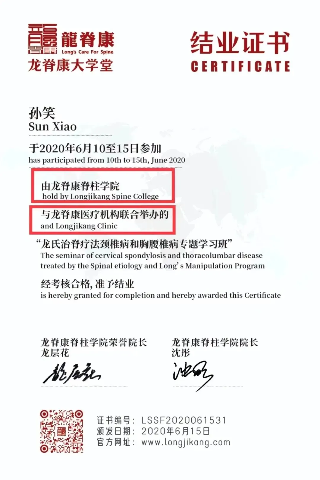 课程是龙脊康康复学堂与龙脊康医疗门诊部联合授课与认证,毕业证将由龙脊康医疗门诊部与龙脊康康复学院联合颁发。