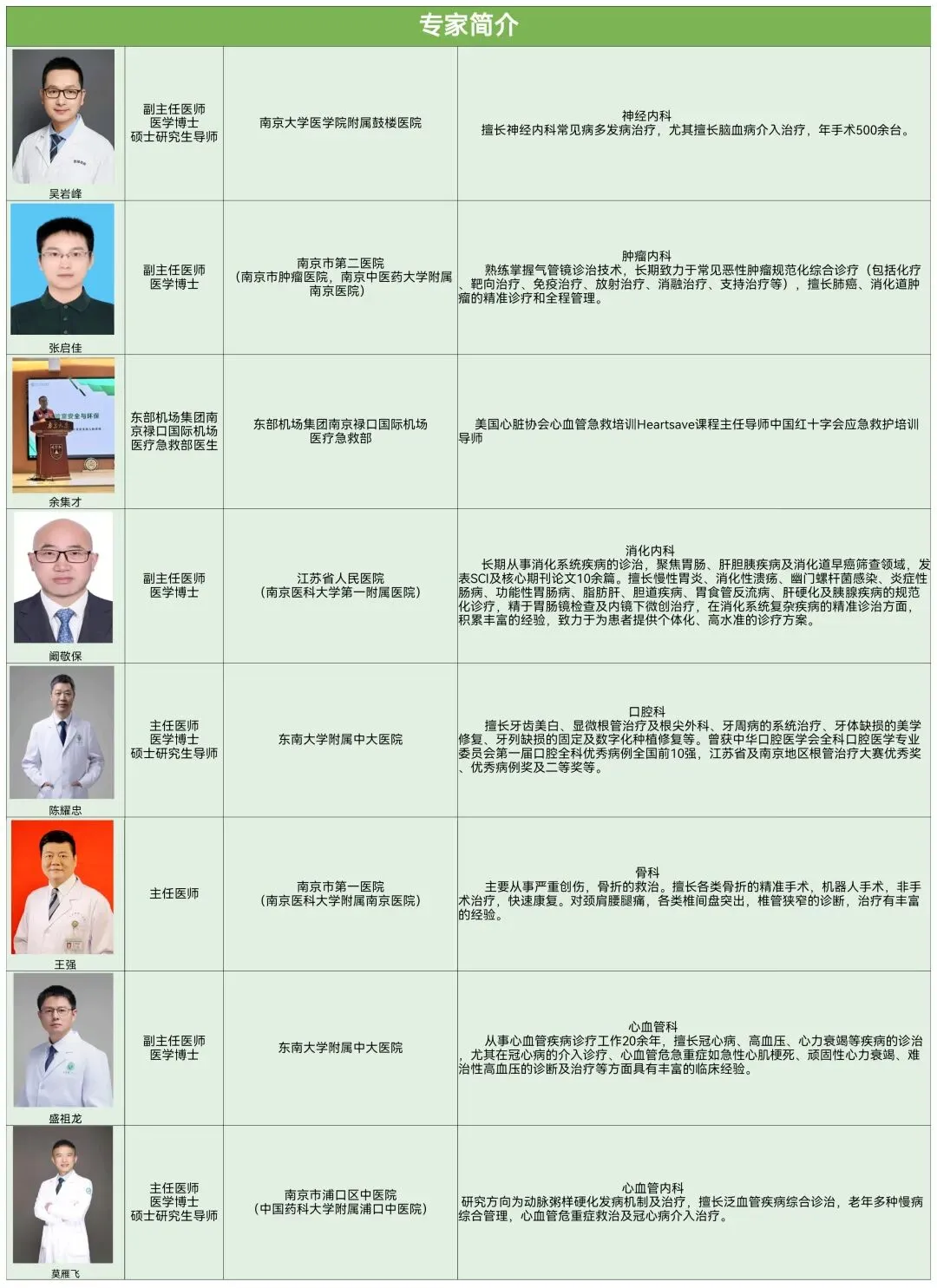 本次义诊专家团由皖南医科大学南京校友会组织,成员均来自南京各大三甲医院,涵盖以下多个重点专科:心血管内科(冠心病介入)、神经内科(脑血管介入)、眼科、消化内科、骨科、口腔科、妇科、产科、内分泌科、呼吸内科、消化肿瘤外科、肿瘤内科、急诊医学、麻醉科(疼痛科)、中医养生针灸科、老年医学科等。