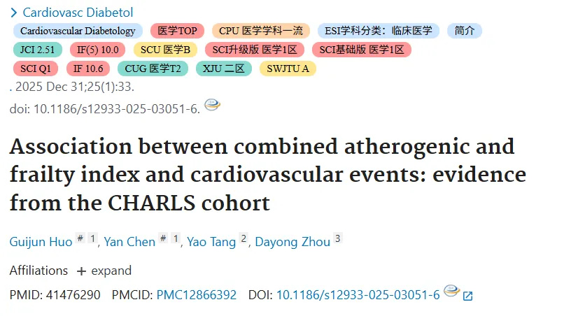 动脉粥样增多和虚弱指数联合与心血管事件的关联:CHARLS队列证据