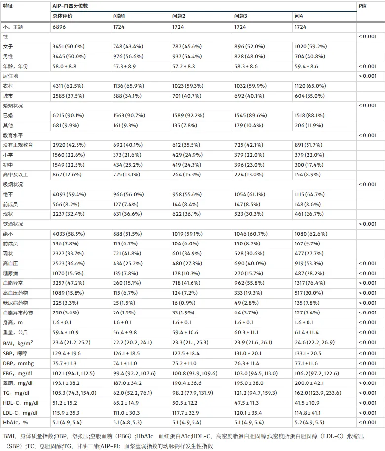 本研究纳入CHARLS 6896 名参与者,平均年龄 58.0±8.8 岁,男女各占 50%。AIP‑FI 越高,人群越年长、女性居多,慢病与代谢指标更差,HDL‑C 更低。