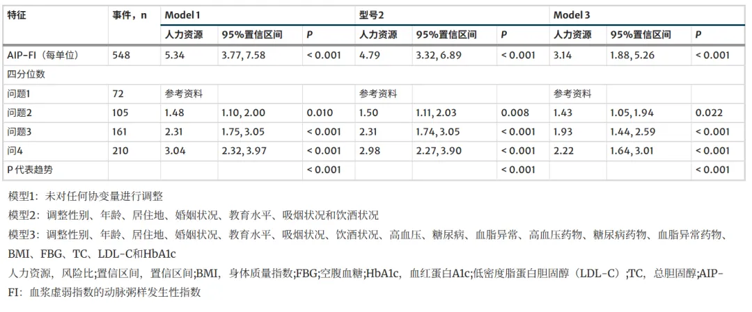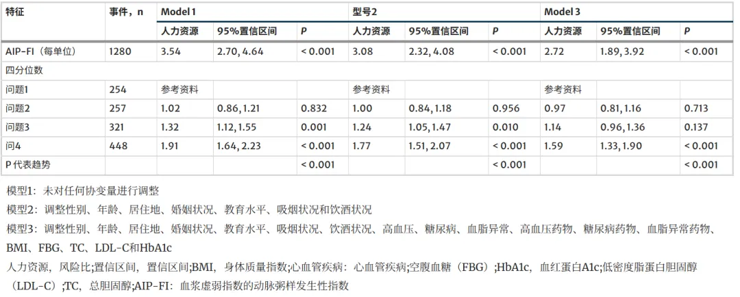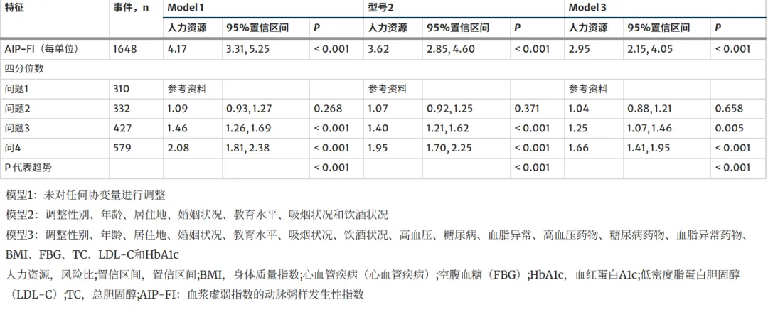 中位随访 9 年,23.9% 发生 CVD、7.9% 中风、18.6% 心脏病。AIP‑FI 每升高 1 单位,CVD 风险增加 195%;Q3、Q4 较 Q1 风险显著升高,呈非线性剂量反应,提示高 AIP‑FI 增加心血管事件易感性。