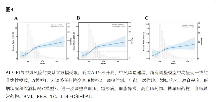 完全调整后,AIP‑FI 每升高 1 单位,中风风险增加 214%(HR=3.14);四分位分析呈梯度升高,最高组风险最强。RCS 证实呈非线性关联,提示 AIP‑FI 升高会显著增加中风风险。