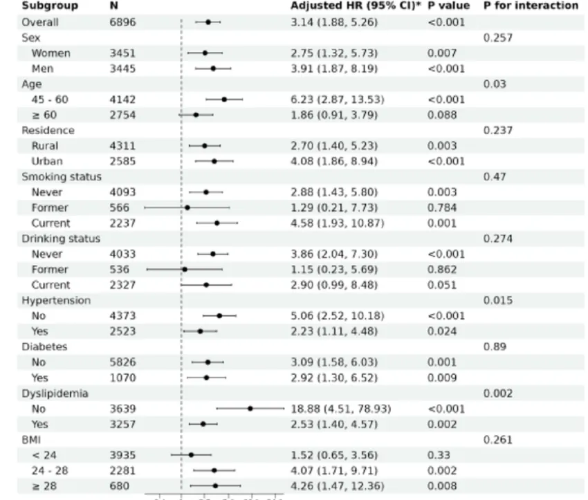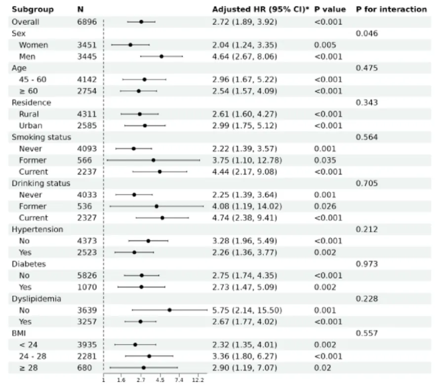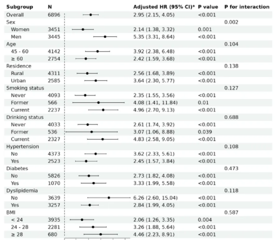 亚组与交互分析证实,AIP‑FI 升高与心血管风险增加总体一致;仅在性别、年龄、高血压、血脂异常方面存在显著交互作用。