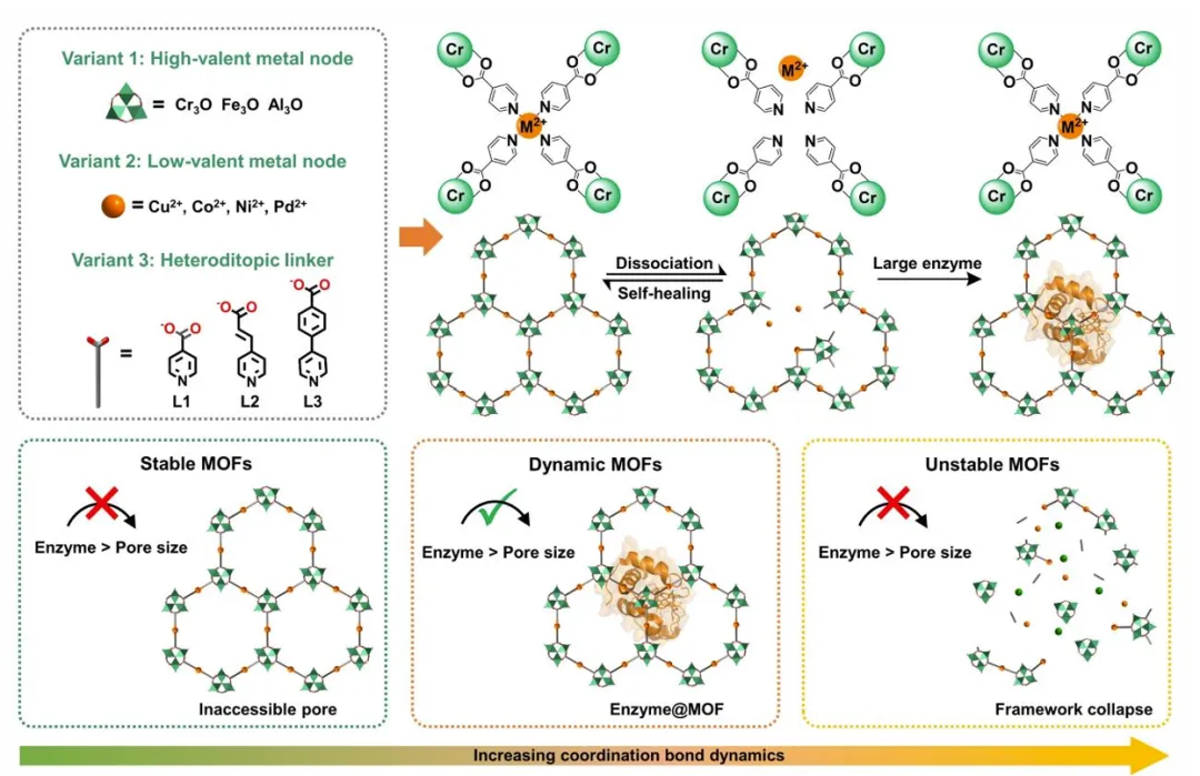 就像试图把一个篮球塞进网球拍的网眼,传统多孔材料(如金属有机框架,MOF)虽然结构规整、性能优异,却因孔道尺寸有限,将许多工业级大分子酶拒之门外。要么强行合成时包裹(条件苛刻),要么只能吸附在表面(易脱落)。怎么办?