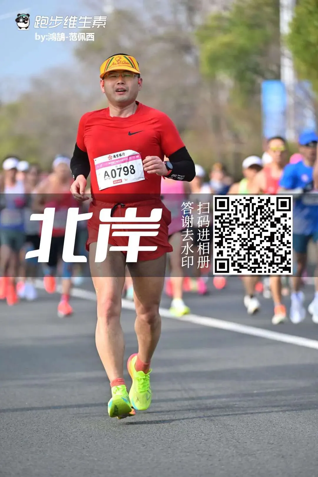到39公里,后面队伍追上来我,我回头瞄一眼没瞄到300兔子,这就比较稳了。快到终点,摄影师越来越多,这时得拿出点儿状态,于是又恢复到4'10以内配速。 冲线时是2:58:20,是2024年以来的最好成绩了。赛道之前介绍是爬升110米,结果跑下来是爬升60米,算是很平坦了;参赛包很豪华,送只1公斤的盐水鸭,还有两支能量胶、三袋盐丸、一袋电解质水、两瓶止痛酊、两袋防磨贴、两袋按摩膏、四个纪念号码簿扣;完赛有烤鸭和盐水鸭,都装好盒了,可以带走。我跑完有点儿腹泻。遇到一位志愿者小妹妹,把一包纸巾都给我了。摄影师很多,坐上地铁,就找到了一百多张相片。